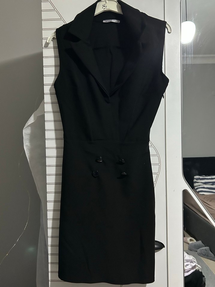 Düğmeli, kolsuz ve siyah midi elbise, kesik yakalı ve normal kalıp ile ofis stiline uygun şık bir tasarımdır. Hasarsız bir iki kez giyildi