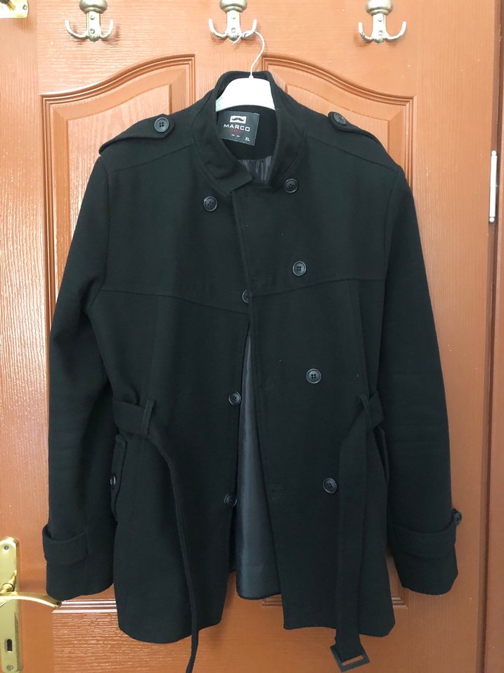 Siyah düğmeli midi erkek kaban, keskin yaka ve uzun kolludur. Yumuşak ve sıcak kumaştan üretilmiş, günlük kullanıma uygun rahat bir kesime sahiptir.