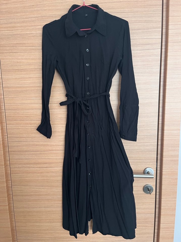 Siyah renkli, düğmeli ve uzun kollu midi elbise. Notlu yaka ve bel bağlama detayına sahip, rahat kesim günlük kullanım için uygundur.