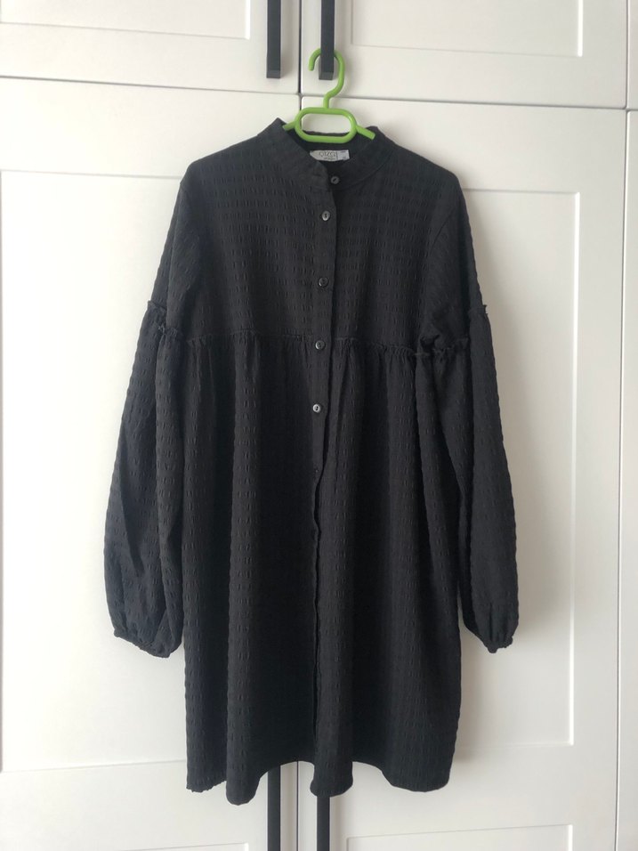 Düğmeli, uzun kollu, yüksek yakalı siyah keten bluz. Rahat kesimi ve midi boyu ile minimalist gotik tarzda günlük kullanıma uygun.