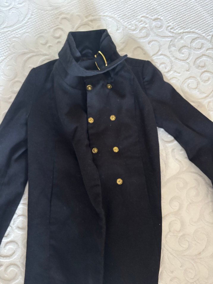 Siyah, düğmeli ve normal uzunlukta kabanı, uzun kollu ve yumuşak dokulu kumaştan ofis kullanımı için uygundur.