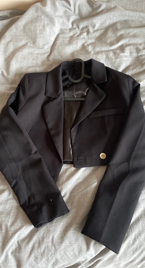 Siyah, düğmeli, midi uzunlukta, kesimli kadın blazer. İpek dokulu, uzun kollu ve yakalı, ofis ve günlük kullanıma uygun.