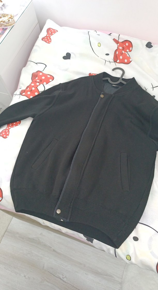 Siyah renkli, düğmeli, midi boy, bol kesim kadın ceketi.