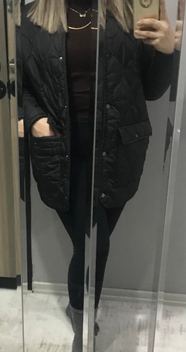 Siyah midi kadın ceket, düğmeli ve cepli. Uzun kollu, geniş kesim ve yakası kesim detaylı. Yumuşak, sıcak kumaştan üretilmiştir.