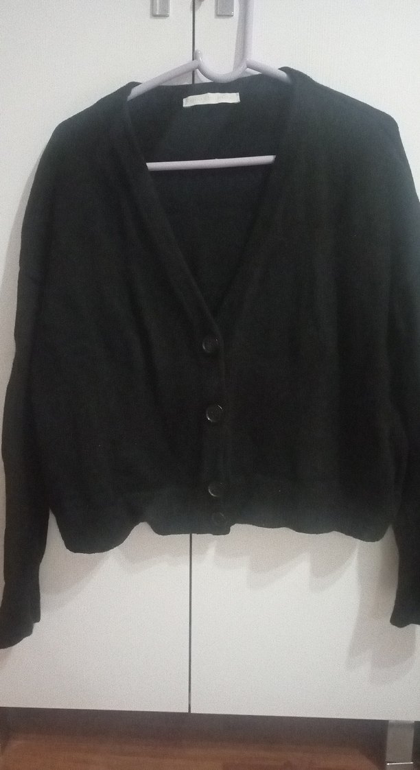 Siyah yün kumaştan, düğmeli, V yakalı ve uzun kollu, bol kesim midi kadın hırka. Minimalist ve normcore tarzda, günlük kullanıma uygun. seçili giyildi bedeni olmuyo artık ihtiyaç fazlası tertemiz hiçbir sıkıntısı yok