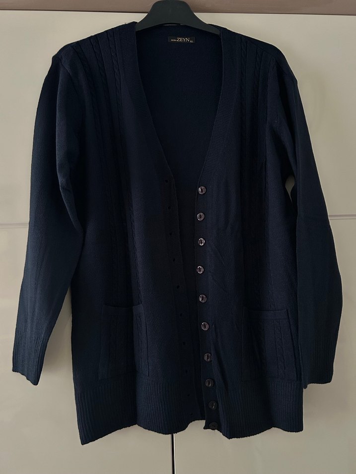 Siyah yün kumaştan, düğmeli, uzun kollu, notlu yaka detaylı, rahat kesim midi kadın hırka. Günlük kullanıma uygun, gotik tarzda.