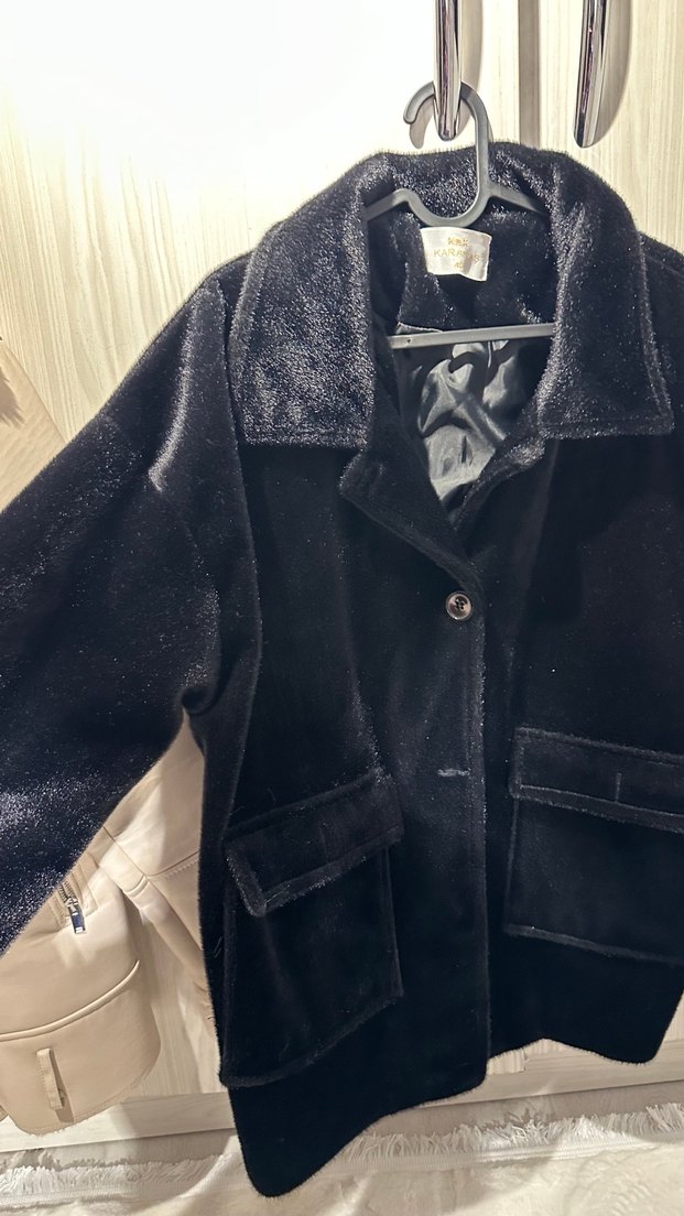 Siyah süet kadın kaban, düğmeli, uzun kollu. Hiç kullanılmadı.