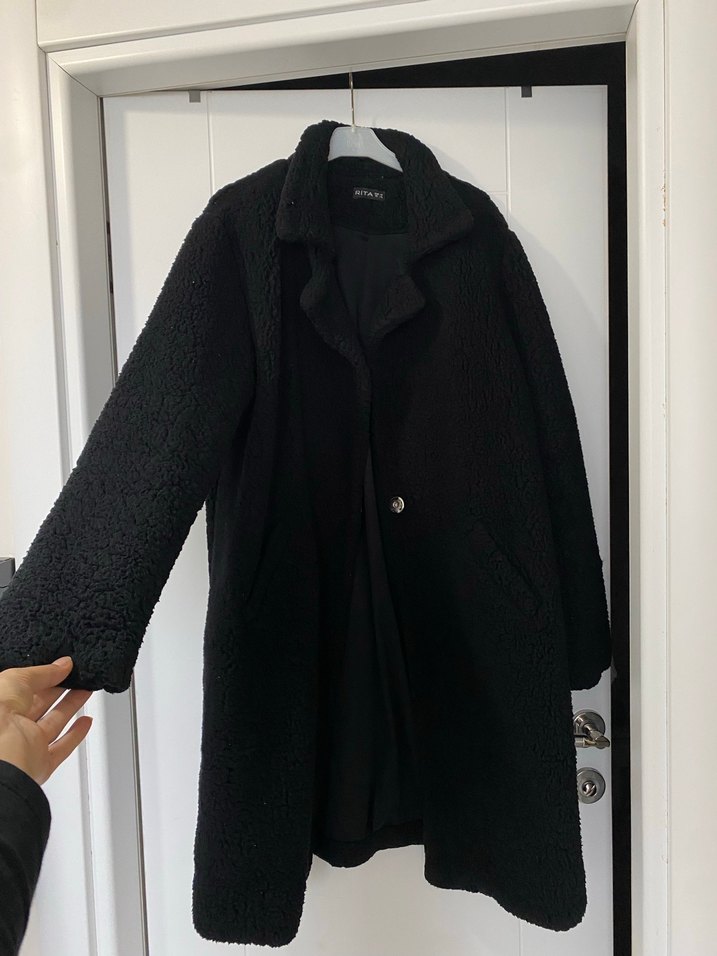 Siyah uzun kollu kaban, düğmeli ve kesik yaka detaylıdır. Yumuşak ve sıcak tutan kumaştan, bol kesim ve midi boyda, rahat sokak stili için uygundur.