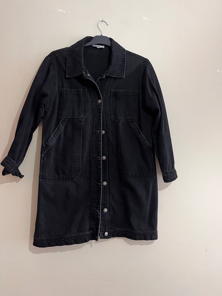 Siyah renkte, düğmeli, uzun kollu ve yakalı midi uzunlukta bol kesim kot ceket. Günlük sokak stiline uygun rahat bir parça.