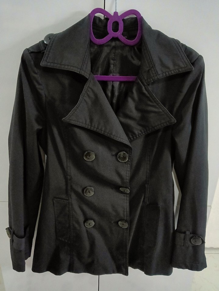 Siyah, düğmeli, satenimsi kumaştan yapılmış, yakası kesik, strappy kollu, gömlek tarzı orta boy trençkot. Ofis için uygun goth tarzı.