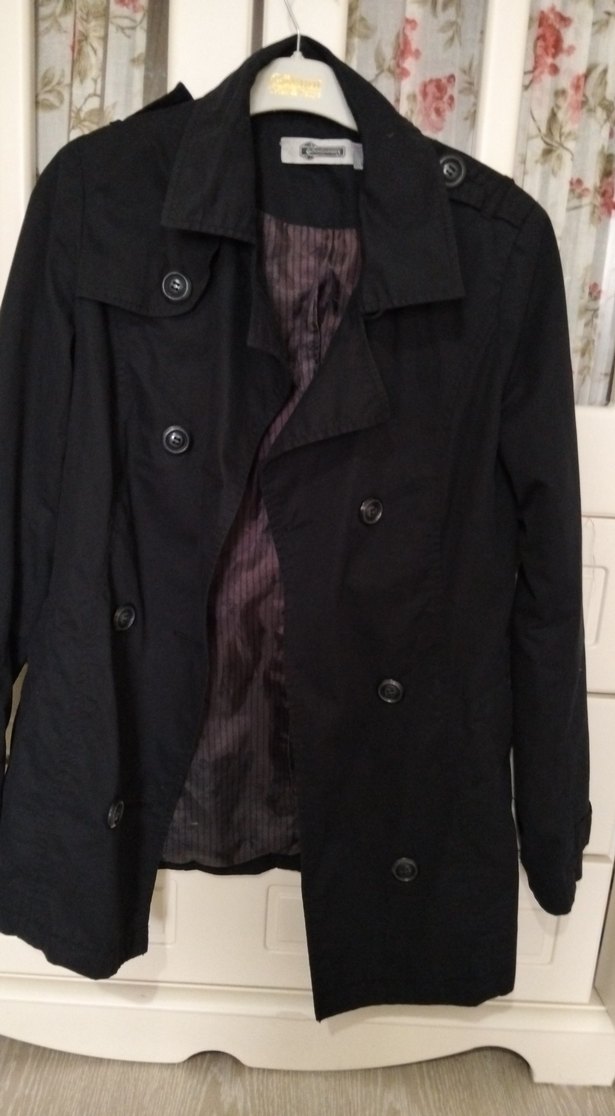 Siyah düğmeli trençkot, kesik yaka ve uzun kolludur. Orta boyda, rahat kesim ve sentetik dokulu kumaştan üretilmiştir.
