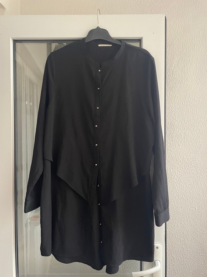 Siyah renkte, uzun kollu ve yüksek yakalı midi tunik. Yumuşak keten kumaştan, düğmeli ve minimalist gotik tarzda, ofis kullanımı için uygun.
