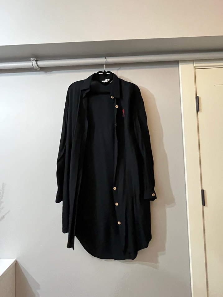 Uzun kollu, düğmeli ve yakası kesimli siyah keten gömlek, bol kesimiyle rahat bir kullanım sunar. Günlük sokak stiline uygun.