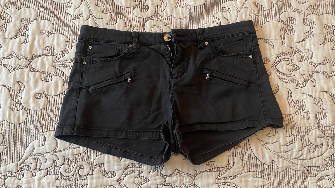 Düğmeli ve fermuarlı cepleri olan siyah, dar kesim mini denim şort. Sokak stiline uygun kısa boy, dış mekan kullanımı için ideal.