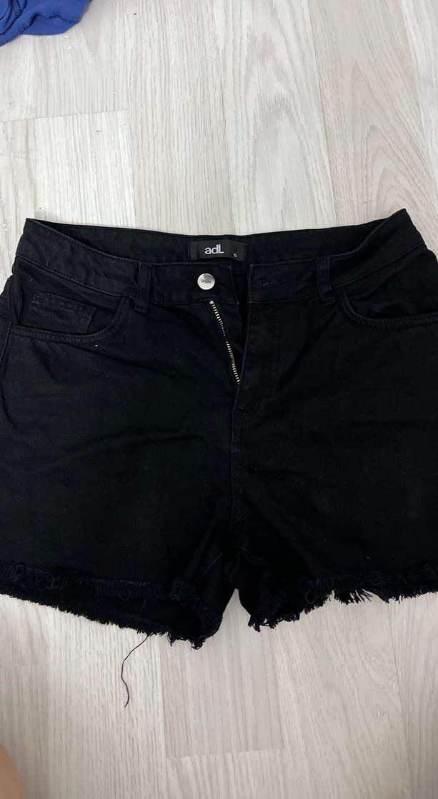 Siyah renk, düğmeli kapamalı, gevşek kesim mini uzunlukta denim şort. Alt kısmı tırtıklı, günlük kullanım için uygundur.