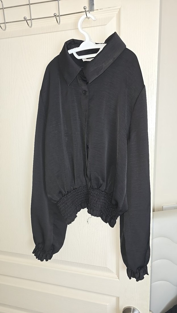 Siyah pamuk saten gömlek, düğmeli ön, bol kesim ve uzun kolludur. Yaka detaylı ve toplanmış etek ucu ile trendy casual tarz sunar. Ofis için uygundur. 60 kg a kadar uygundur