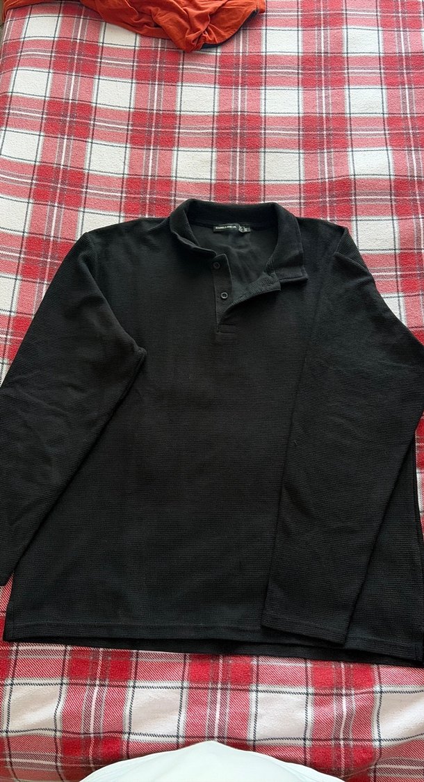 Siyah, düğmeli, polo yakalı uzun kollu erkek sweatshirt. Rahat kesim ve normal boyda, günlük sokak stiline uygun.