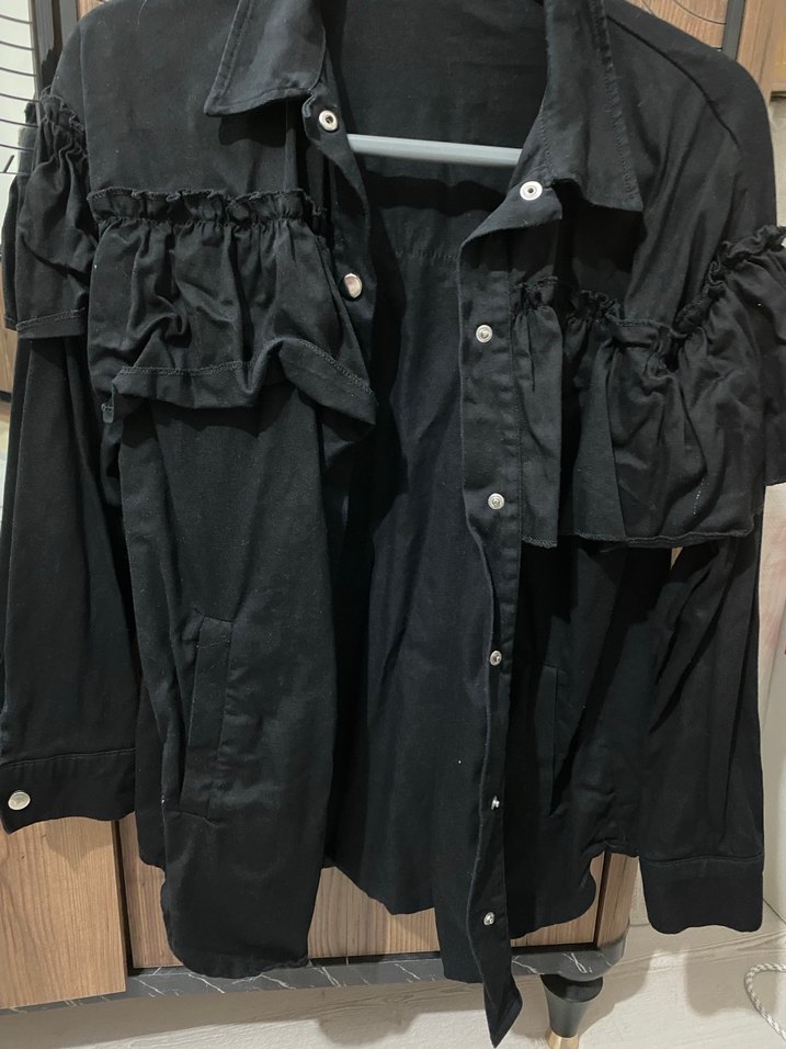 Bu siyah keten ceket, düğmeli, uzun kollu ve rahat kesimdir. Notlu yakaya sahip olup midi boydadır, günlük ve sokak stiline uygundur.