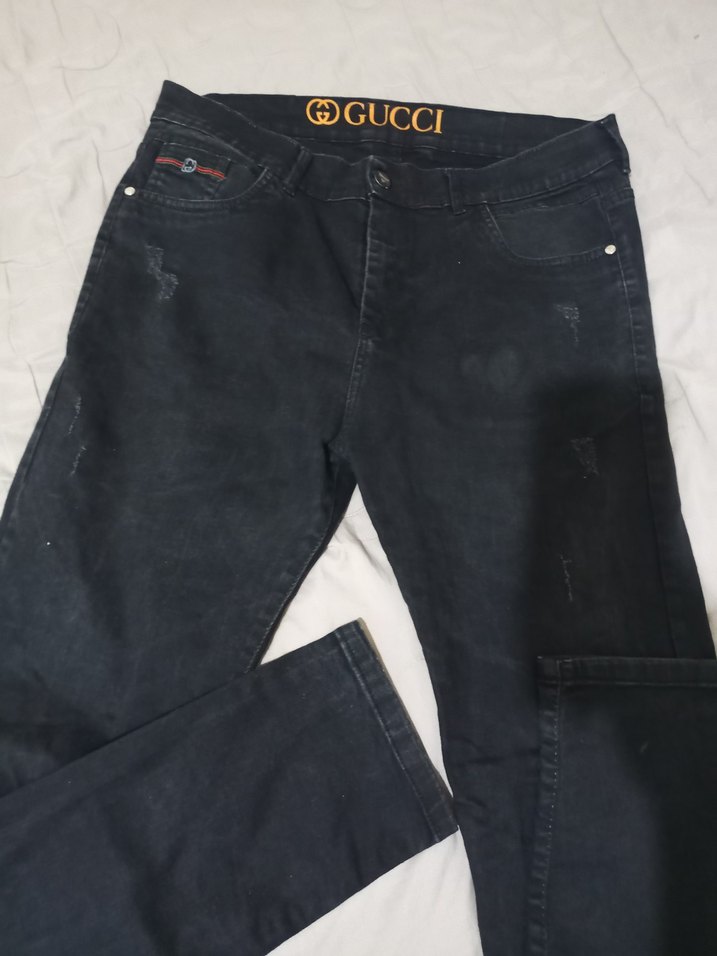 Siyah denimden yapılmış, regular fit ve düğmeli erkek kot pantolon. Desensiz tasarımı günlük rahat kullanıma uygundur. Bel kısmında GUCCI logosu bulunur.