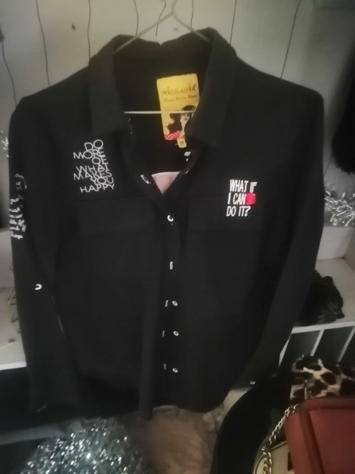 Siyah tekstil kumaştan, uzun kollu, düğmeli ve baskılı rock punk tarzı kadın ceketi. Normal boyda, notched yaka ve regular fit özelliklerine sahiptir.