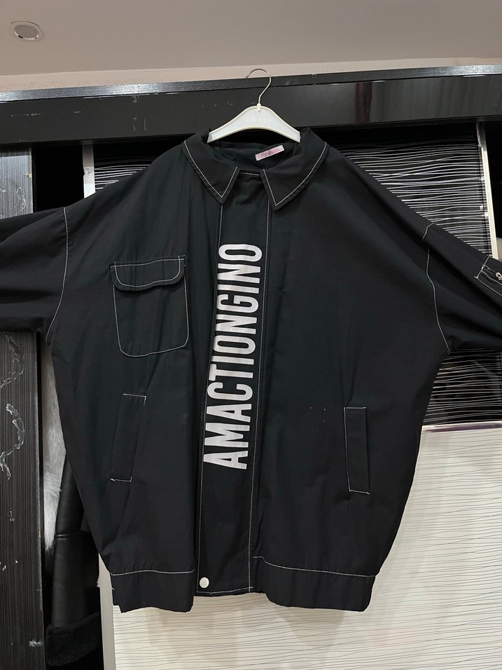 Uzun kollu, düğmeli, salaş kesim siyah kadın ceket. Yuvarlak yaka ve baskılı detaylarla günlük kullanıma uygun, sentetik kumaştan.