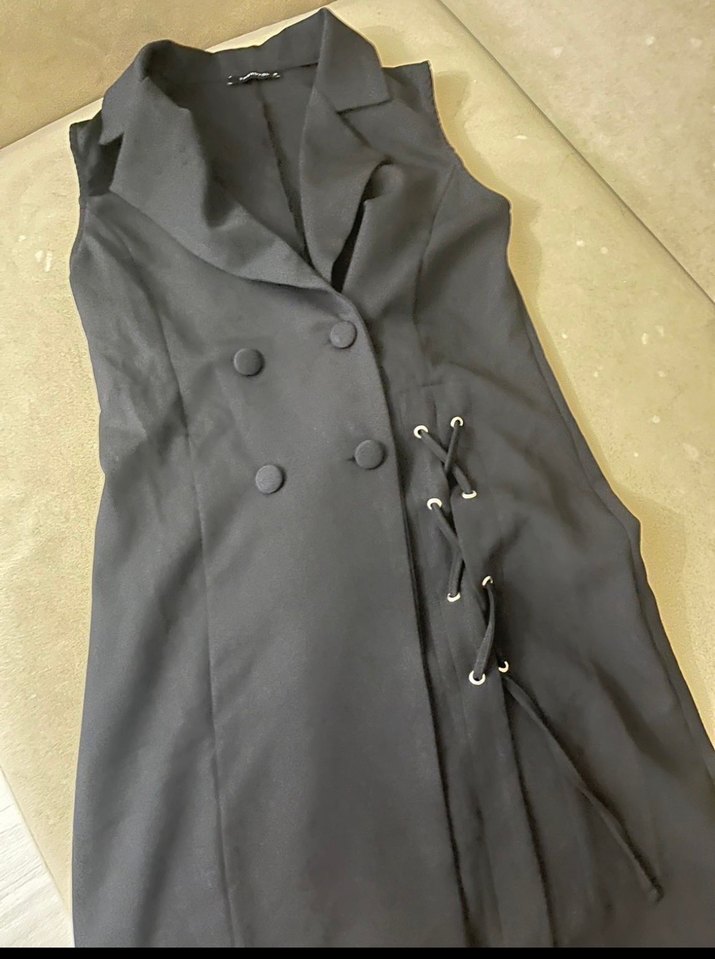Siyah renkte, düğmeli ve yakalı, kolsuz uzun kesim kadın kaban. Sentetik kumaştan, ofis için uygun gotik tarzda.