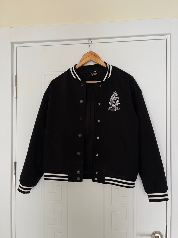 Siyah renkli, düğmeli, uzun kollu, baskılı ve bol kesim kadın ceket. Ribanalı manşet ve etek ucu ile ofis için uygun şık parça.