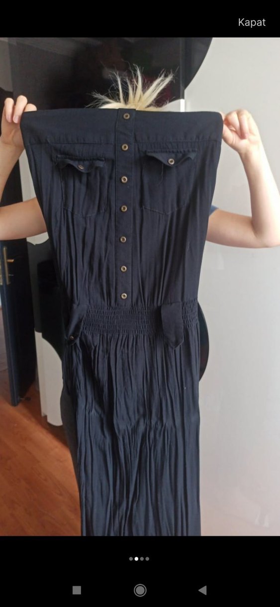 Siyah, düğmeli, straplez hamile tulumu, bol kesim ve yumuşak keten kumaştan yapılmıştır. Midi boy ve kolsuz tasarımıyla gündelik kullanım için uygundur.