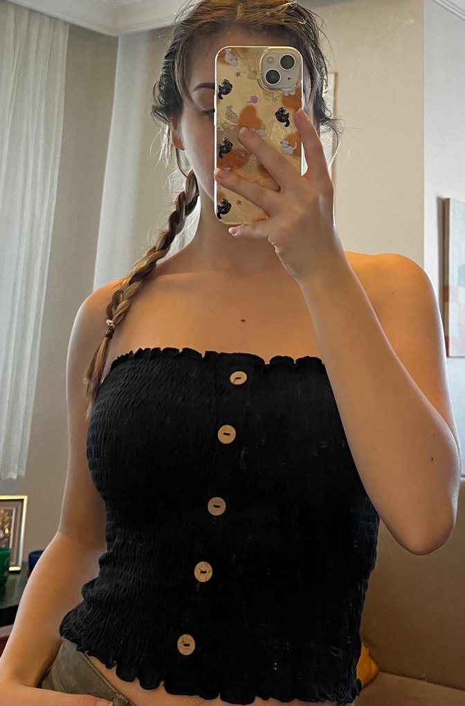 Siyah, düğmeli, straplez yaka ve midi boyda, vücuda oturan bu büstiyer, yumuşak sentetik kumaştan üretilmiştir. Günlük sokak modasına uygun bohem tarzda bir üründür.