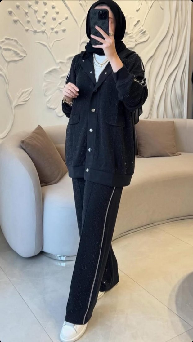 Siyah Düğmeli Taşlı Kadın Takım