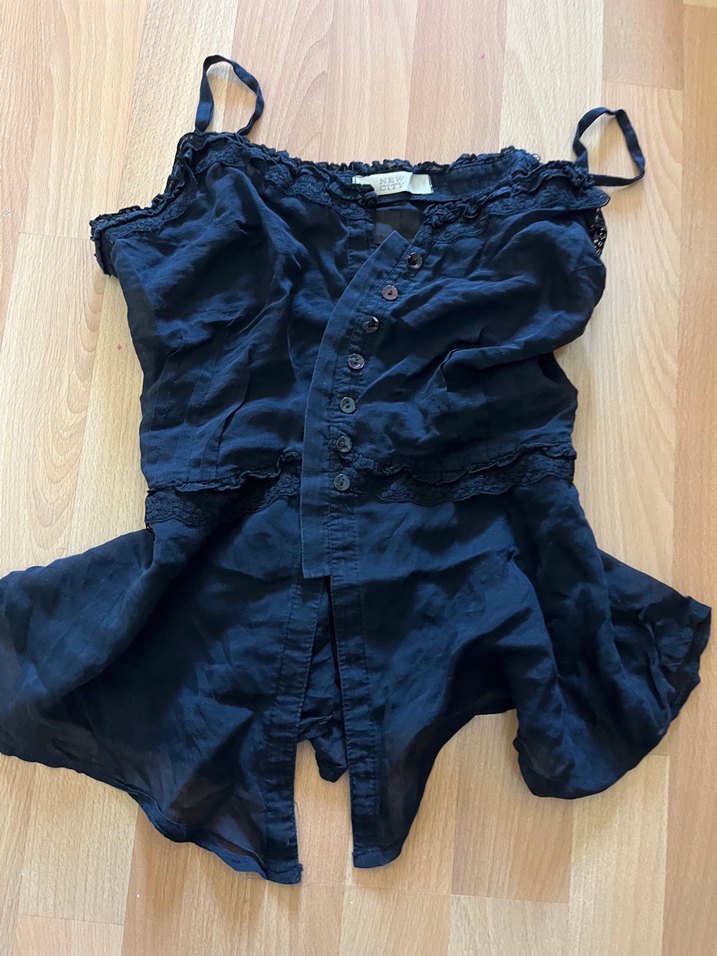 Siyah renk, düğmeli, ince askılı, midi boyda ve loose fit kesime sahip transparan bluz. Desensiz sade tasarım. uzunluk en uzun kısımdan 44 cm bel 35