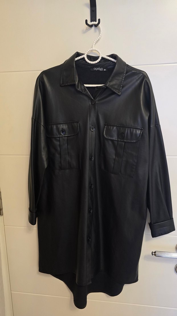 Siyah uzun deri kadın ceket, düğmeli ve yakalıdır. Salaş kesimi ve uzun kollarıyla sokak stiline uygundur.