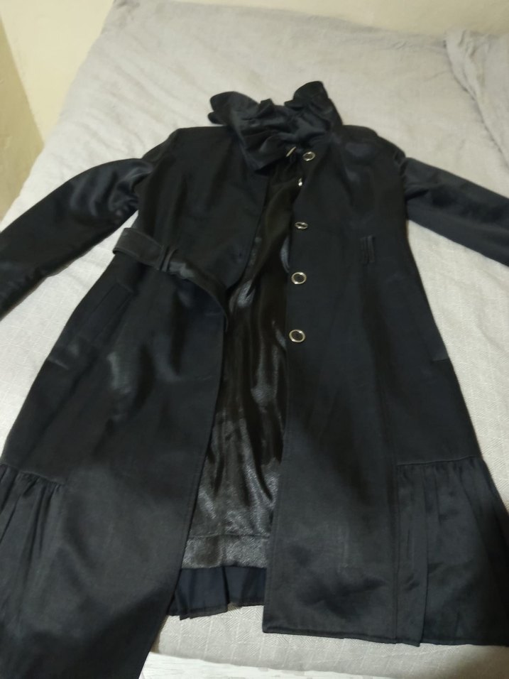 Siyah, düğmeli, uzun ve satenimsi kumaştan, kesimli gotik tarzda kadın kaban. Notlu yaka ve askılı kollara sahip, şık ve desensiz.