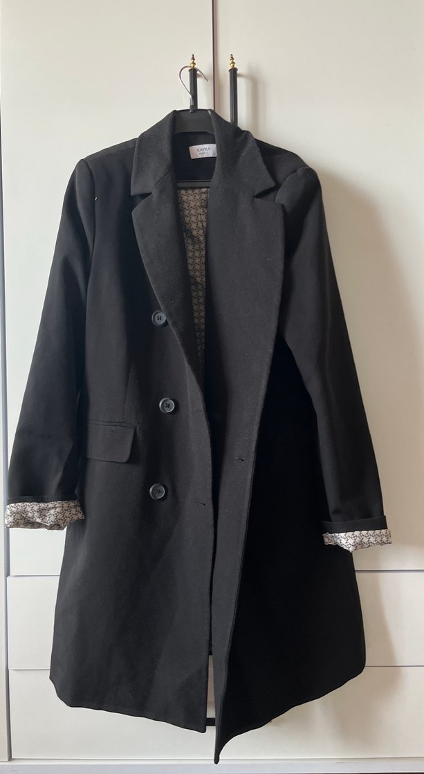 Siyah düğmeli, uzun kollu hamile kabanı, notched lapel yakaya sahip. Sentetik kumaştan, regular fit ve uzun boyda, ofis ve günlük kullanıma uygun. Hafif tiftiklendi