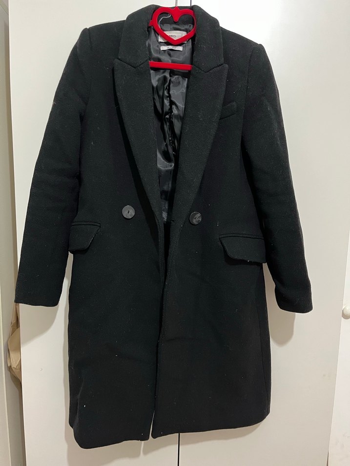 Düğmeli ve kapaklı ceplere sahip uzun siyah kaban, rahat kullanım için iç astarlı. Serin havalar için uygun. Astarı yırtıldı biraz dar geliyor biraz tiftiklenmesi var ama sağlam orijinal mango