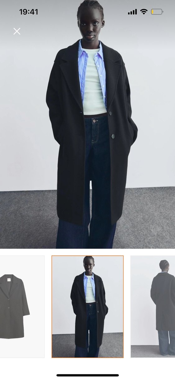 Düğmeli, yan cepli ve rahat kesim siyah uzun kaban, yumuşak dokulu kumaştan üretilmiştir.