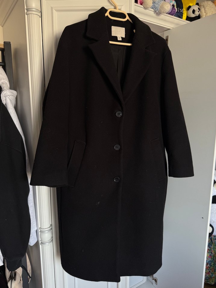 Klasik yakalı, düğmeli siyah uzun kaban. Yan cepleri var, soğuk havalar için yumuşak ve sıcak kumaştan yapılmıştır.