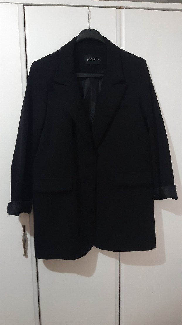 Siyah renkli, yaka detaylı, uzun kollu ve düğmeli kadın blazer ceket. Ceket boyu 75 cm iki kol arası 50 cm yırtmaçlı sahte cepli.
