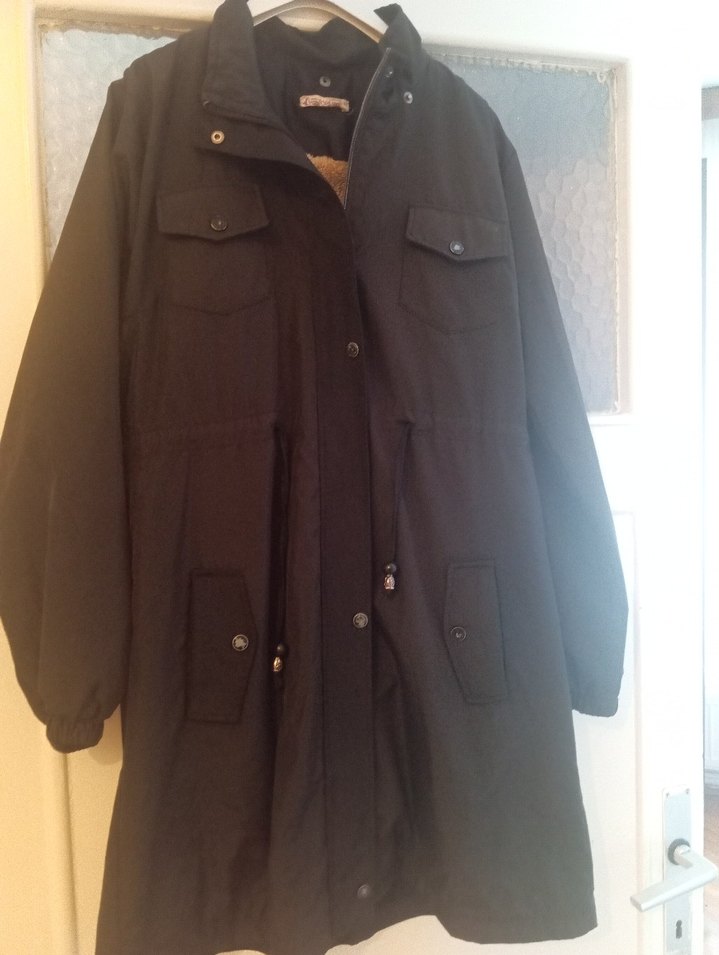 Siyah, uzun paçalı kadın ceketi, yakalı ve düğmeli kapamalıdır. Rahat kesimi ve yumuşak, sıcak kumaşıyla gündelik sokak stiline uygundur. Uzun kollu ve düğmeli ceplidir.