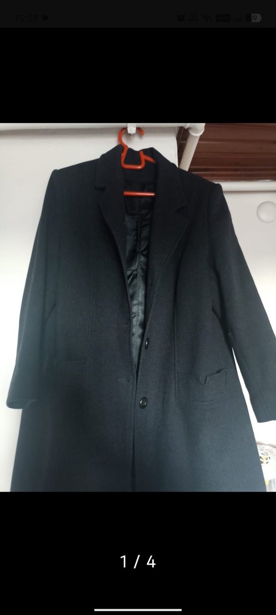 Siyah uzun kadın kaban, düğmeli ve kesimli yakaya sahip. Uzun kollu, rahat kesim ve yumuşak sıcak kumaştan üretilmiştir.