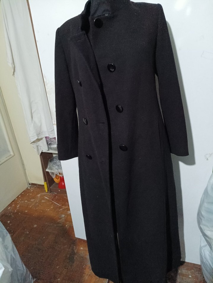 Siyah, düğmeli, uzun kollu klasik kesim kadın kaban. Yumuşak ve sıcak kumaştan, ofis kullanımı için uygun. iki koltuk altı mesafe 52 cm boyu 126 cm kalın kaşe MİCCA MARKA