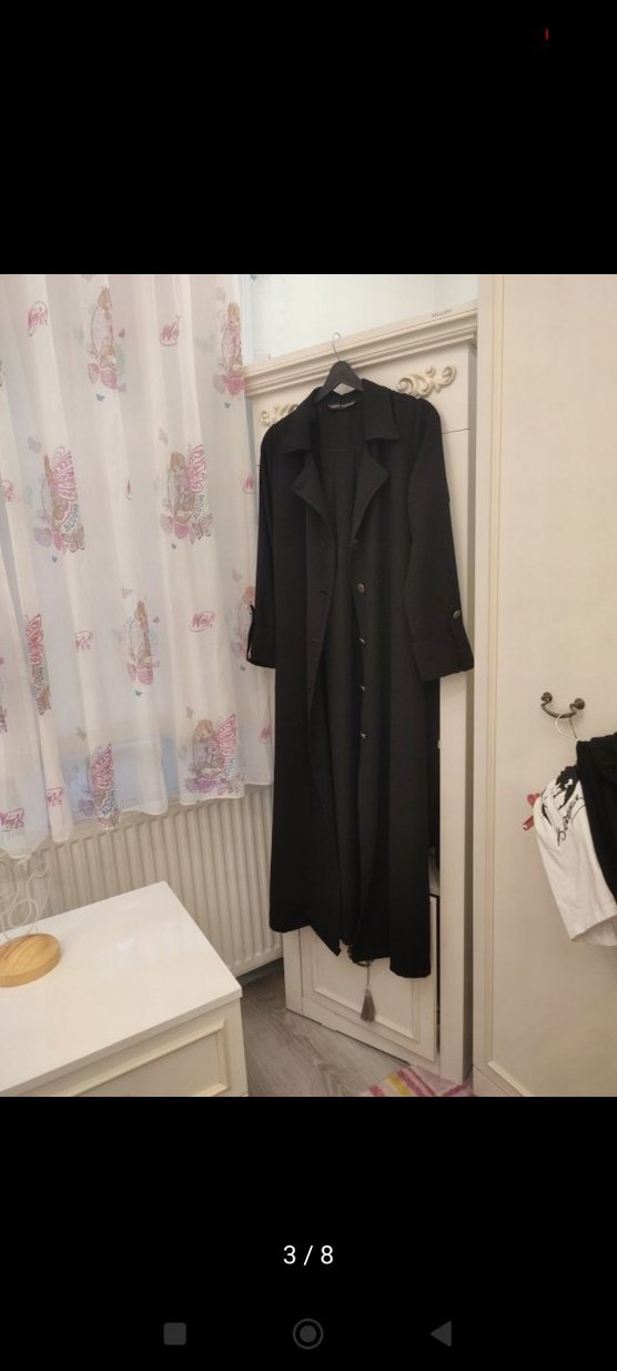 Siyah krep kumaştan uzun trençkot, düğmeli ve kesik yakalıdır. Uzun kollu, klasik şıklık için tam boy 130 cm yazlık ince kumaş kusur defo yoktur