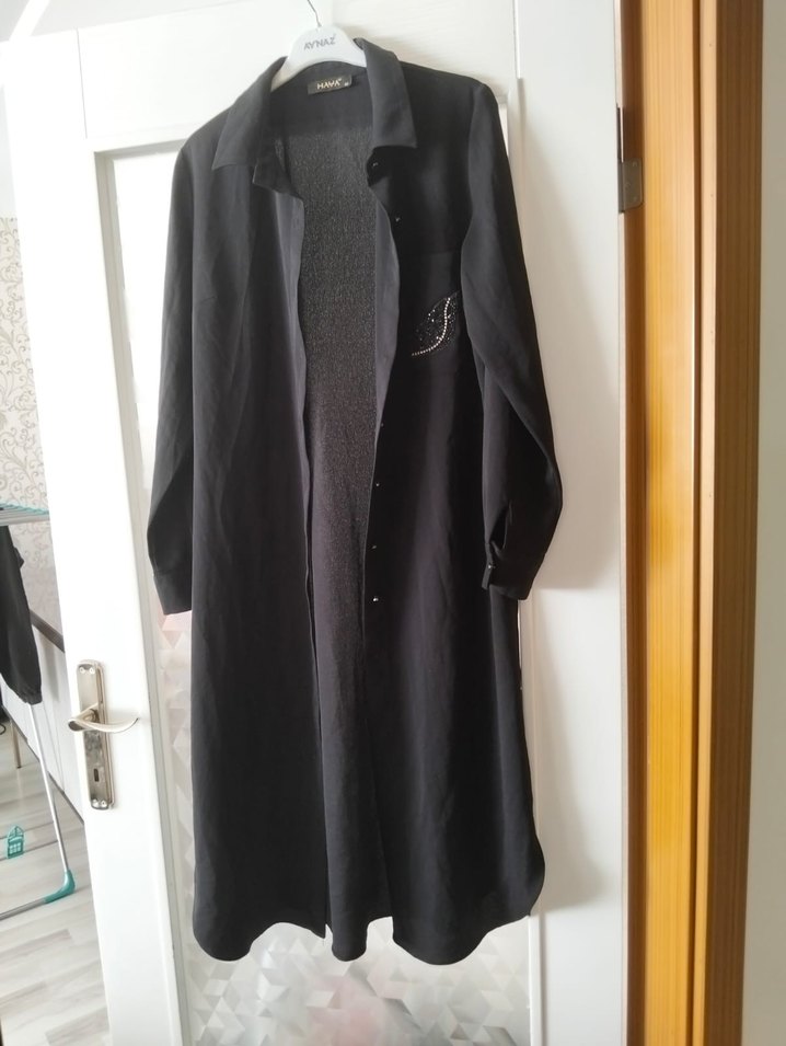 Siyah düğmeli uzun kaban, bol kesim, çentikli yaka ve uzun kollu. Sentetik kumaştan yapılmış, minimalist gotik tarzında günlük kullanım için uygun.