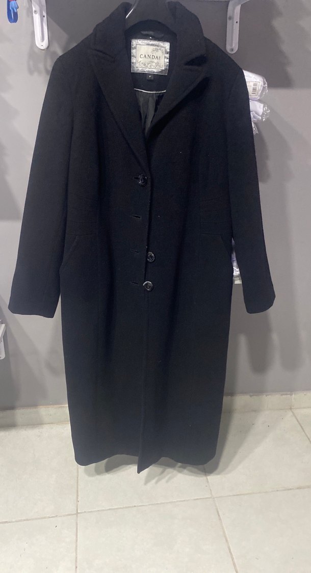 Siyah uzun kadın kaban, düğmeli ön ve keskin yakalıdır. Rahat kalıp ve uzun kollu, yumuşak ve sıcak kumaştan üretilmiştir. Ofis için klasik şıklık sunar.