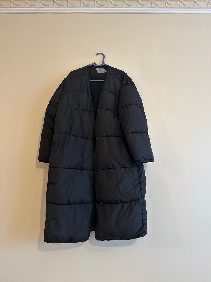 Siyah uzun kadın montu, düğmeli ve geniş kesimlidir. Uzun kollu ve yumuşak dokulu, sade tasarımıyla gündelik kullanıma uygundur. Boyu omuzdan itibaren 105cm kolu 55cm genişliği 60cmdir.