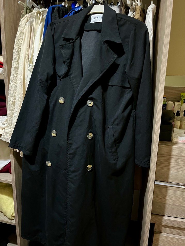 Siyah renkli, düğmeli uzun trençkot. Notlu yaka ve düz deseniyle günlük rahat sokak stiline uygun, sentetik kumaştan üretilmiştir.