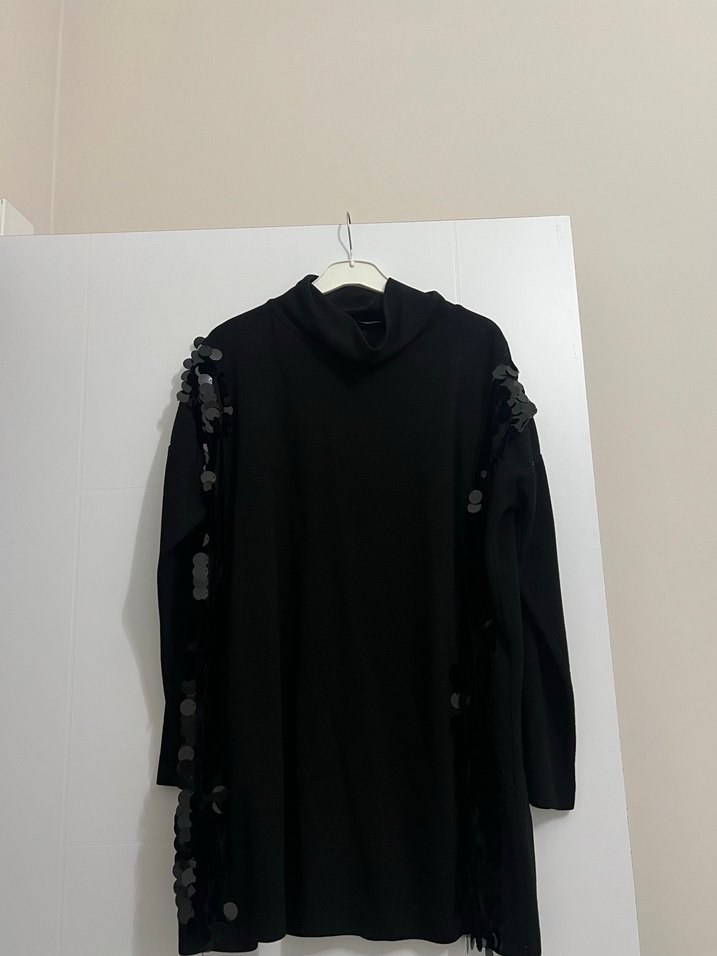 Siyah, uzun kollu ve boğazlı bu tunik bol kesimdir. Kollar ve yanlarda düğme detayları bulunur, yumuşak ve sıcak kumaştandır. Günlük kullanıma uygundur.