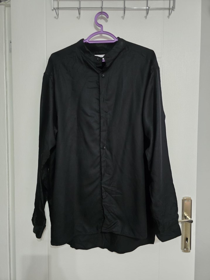 Siyah, ipeksi kumaştan yapılmış, düğmeli ve uzun kollu erkek gömleği. Bol kesim ve yakalı, minimal ve gotik tarzda, ofis için uygun midi boyda.