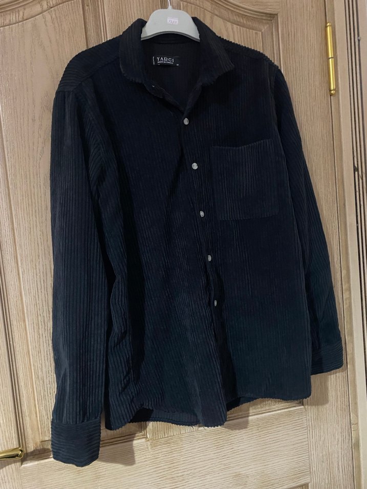 Siyah, kadife kumaştan yapılmış, düğmeli, uzun kollu ve yakalı erkek gömleği. Rahat kesimi vgünlük kullanım için uygundur.