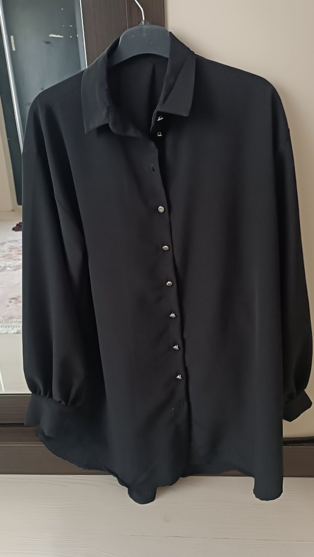 Siyah, düğmeli, uzun kollu, yakalı ve midi uzunlukta kadın gömleği. İpeksi kumaştan, bol kesim ve desensiz, ofis için uygun goth ve Paris tarzı.Balon kol L/XL uyumlu
